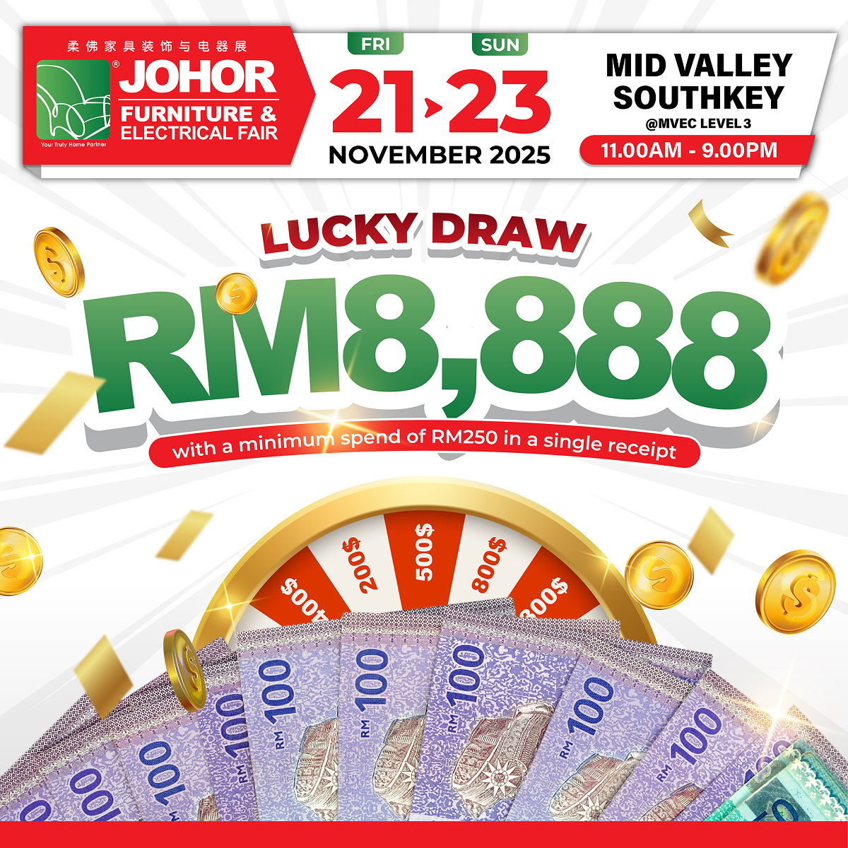 Check out the event highlights we have at Johor Furniture Fair for 3 days only! Be ready & don’t miss out on our exciting events.